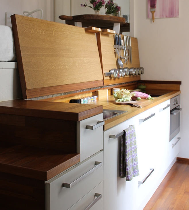 Hệ thống giường ngủ, bàn ăn và bếp nấu được tích hợp liên hoàn một cách khéo léo và ấn tượng. Nơi nấu nướng được thiết kế độc đáo với bếp nấu và bồn rửa, phía trên được lắp đặt nắp đậy từ gỗ giúp tạo mặt phẳng gọn gàng sau khi nấu nướng xong. Khi cần sử dụng, bạn chỉ cần lật hai mặt phẳng gỗ này lên là đã có được không gian nấu tiện nghi, hữu dụng.
