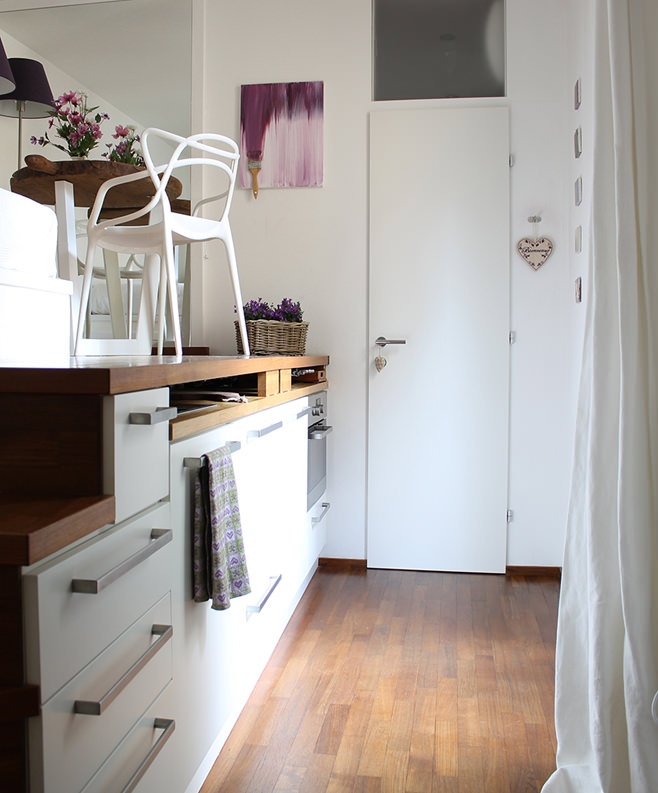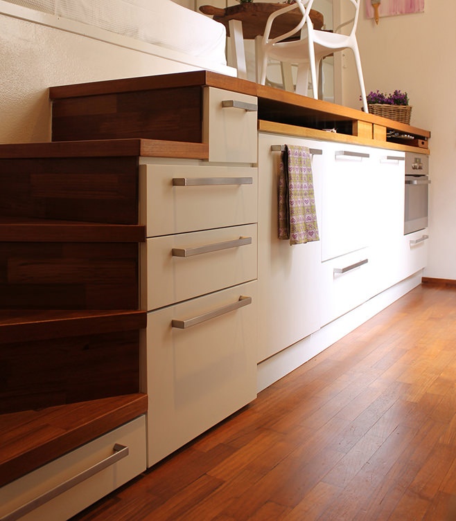 Không bỏ qua một centimet nào trong căn hộ nhỏ, phía dưới bếp nấu và bồn rửa được thiết kế hệ thống tủ lưu trữ đồ kèm lò nướng một cách khéo léo và tiện dụng.
