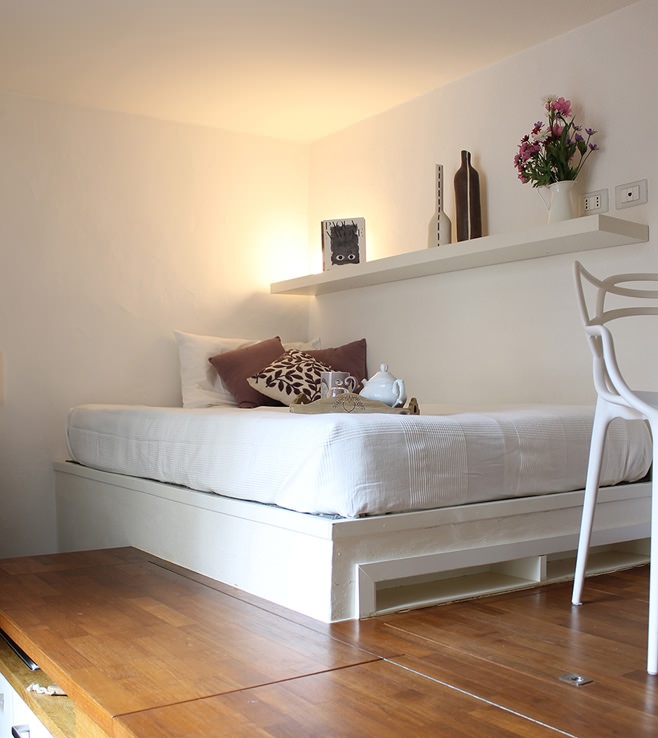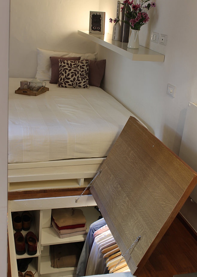 Lật sàn gỗ gần với giường là cả một khoảng diện tích tuyệt vời cho việc lưu trữ quần áo, đồ đạc.
