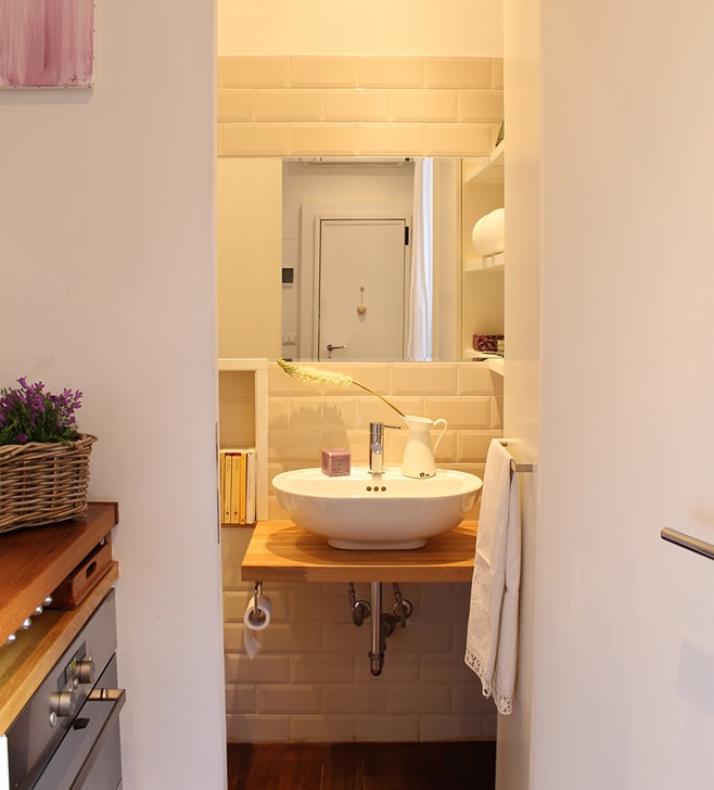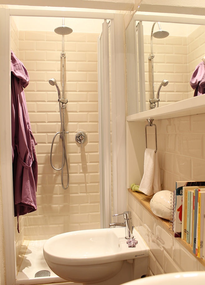 Đối diện với cửa ra vào là không gian riêng tư được sử dụng cho việc tắm táp, thư giãn hàng ngày của gia chủ. Dù chỉ khoảng 14m2 nhưng mọi khu vực chức năng đều đủ đầy và tiện nghi cho cuộc sống độc thân. Phòng tắm thiết kế khá đơn giản với các vật dụng, nội thất cơ bản. Tuy nhiên, sự khéo léo trong việc chọn lựa nội thất và thiết kế các kệ chức năng mang lại nét đẹp tinh tế và tiện ích cho không gian.