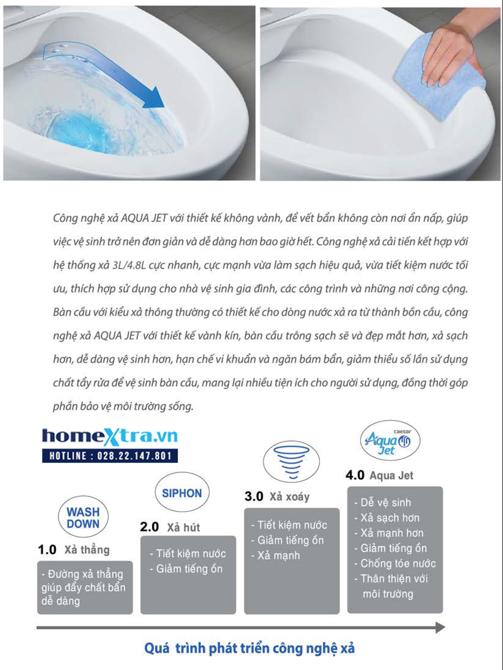 - Công nghệ xả AQUA JET của Caesar với thiết kế không vành, để vết bẩn không còn nơi ẩn nấp, giúp việc vệ sinh trở nên đơn giản và dể dàng hơn bao giờ hết. Công nghệ xả cải tiến kết hợp với hệ thống xả 3L/4.5L cực nhanh, cực mạnh, vừa làm sạch hiệu quả, vừa tiết kiệm nước tối ưu, thích hợp sử dụng nhà vệ sinh gia đình, các công trình và những nơi công cộng.