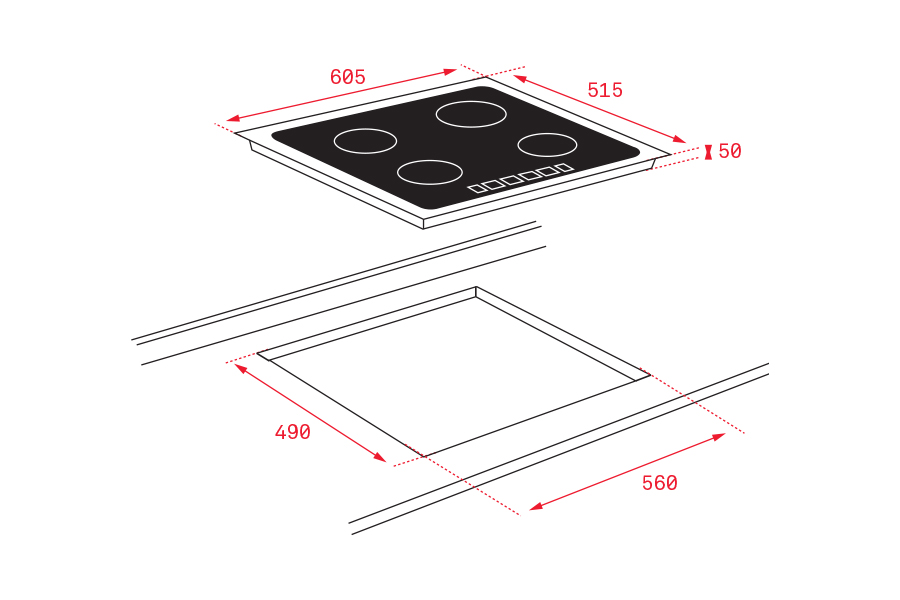 - 03 mặt bếp nấu: 01 bếp có vòng nhiệt đôi Ø 180/280mm; 02 bếp oval 235 x 180mm.