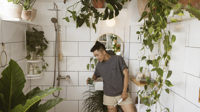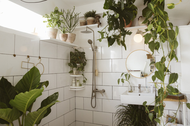 Vì rất thích cây cối, lại muốn tận dụng khung cửa sổ to đón ánh sáng tự nhiên nên cuối cùng, Carrot quyết định làm một nhà tắm nhỏ theo phong cách hòa hợp thiên nhiên. Tường nhà tắm được anh chàng lát bằng gạch trắng vừa làm không gian sáng sủa hơn vừa sạch sẽ. Điểm xuyết khắp các góc là nhiều chậu cây xanh mướt.