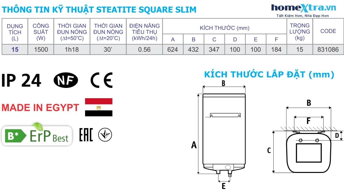 Bình nước nóng Atlantic STEATITE SQUARE SLIM 30 lít