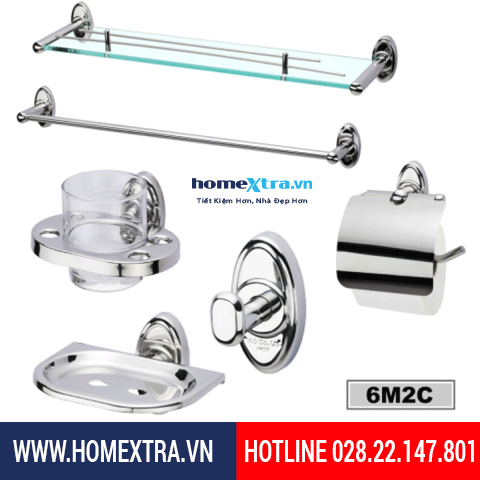 - Bộ phụ kiện 6 món gồm :Thanh vắt khăn dài M2-2001 - Kệ kính M2 - 2002 - Hộp giấy vệ sinh M2 - 2003 - Kệ xà phòng M2 - 2006 - Kệ để ly M2 - 2005 - Móc áo BN - 311