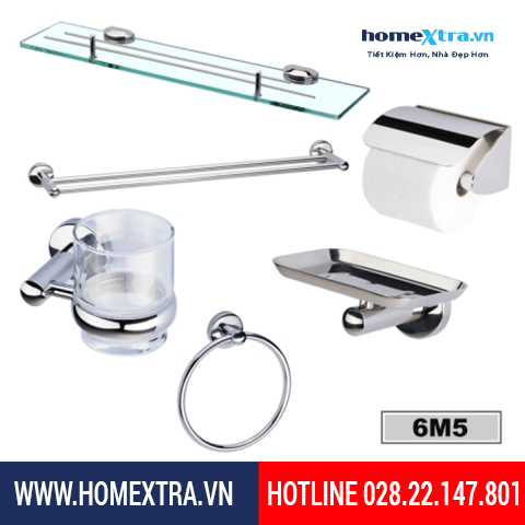 - Bộ phụ kiện 6 món gồm : Thanh vắt khăn dài M5-501 - Kệ kính BN-700 - Hộp giấy vệ sinh HG01 - Kệ xà phòng M5-506 - Kệ để ly M5-505 - Máng khăn vòng M5-504