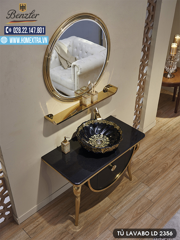 - Bộ Tủ chậu lavabo inox 304 Benzler LD-2356 với tone màu vàng đen chủ đạo, tạo nên không gian phòng tắm sang trọng lịch lãm