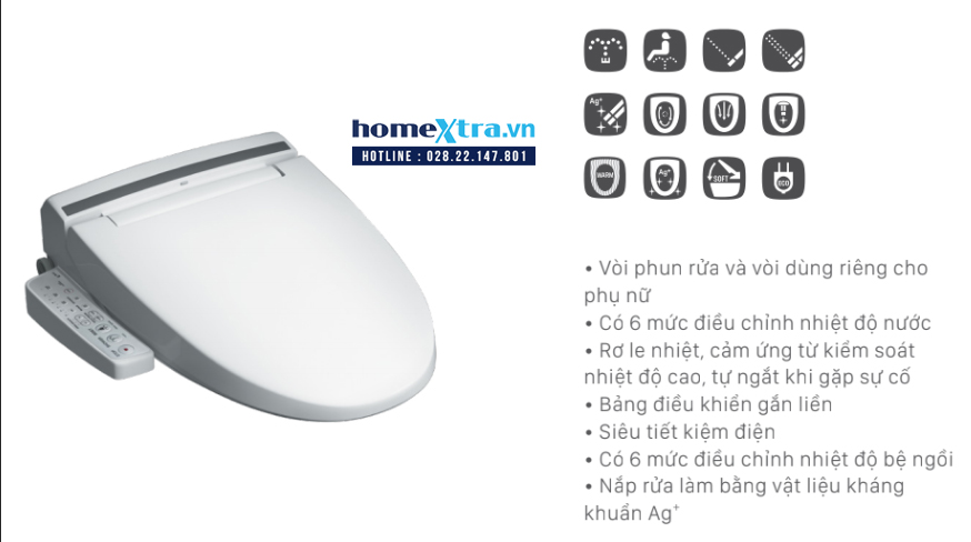 - Công suất bệ ngồi: 45W Nhiệt độ bệ ngồi: OFF: nhiệt độ phòng; LOW: ~28oC; MID: ~36oC; HIGH: ~40oC