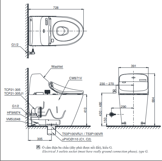 - Bàn cầu điện tử một khối GG kèm nắp rửa điện tử Washlet TCF9433A (220V)