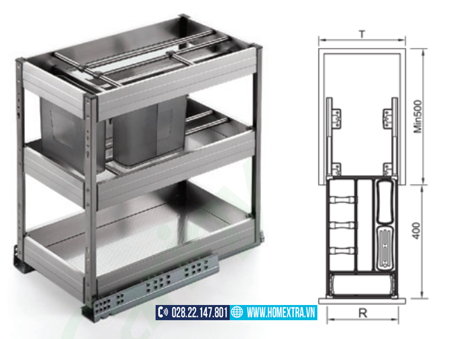 - Kệ gia vị đa năng, Inox hộp, ray âm giảm chấn, lắp cho mặt cánh rộng 350 mm.