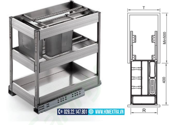 - Kệ gia vị đa năng, Inox hộp, ray âm giảm chấn, lắp cho mặt cánh rộng 400 mm