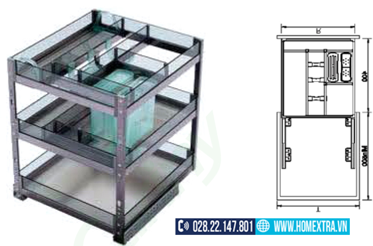 - Kệ gia vị, dao thớt đa năng, Inox hộp vách kính cường lực, ray âm giảm chấn, lắp cho mặt cánh rộng 400 mm