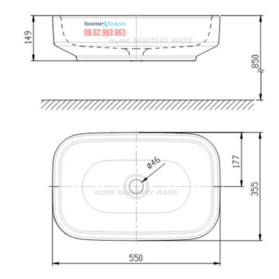 - Kích thước chiều dài 550mm, chiều rộng 335mm, chiều cao 149mm