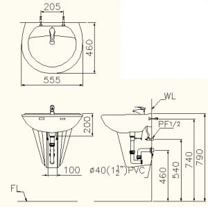 - Chậu treo tường L2220 kích thước 550 x 460 x 200 mm