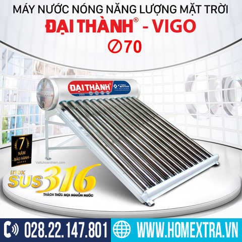 Bảng giá khuyến mãi máy nước nóng năng lượng mặt trời cao cấp Đại Thành dòng Vigo inox SUS 316 ống thu nhiệt Ø70: