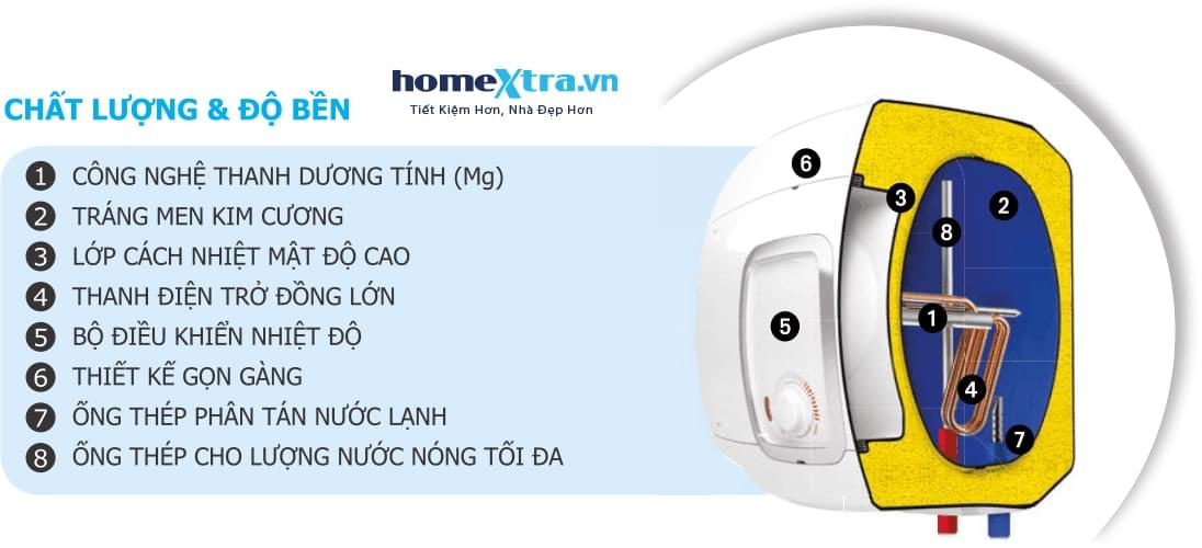 - Dung tích máy nước nóng 30 lít (khoảng 5 người sử dụng)