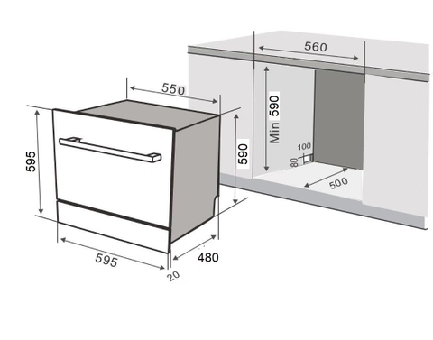 - + Kích thước âm tủ: 550R x 480S x 590C(Min) mm