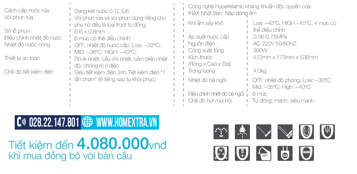 - - Warm Dryer: Khí ấm sấy khô nhanh, dịu nhẹ mang lại sự sạch sẽ, an toàn tiện ích, không cần dùng giấy vệ sinh