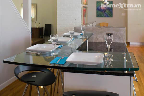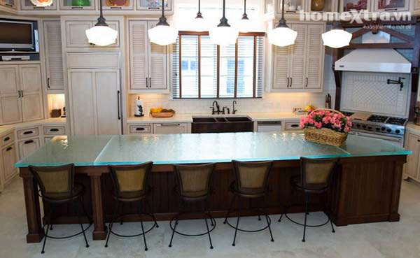Bạn có thể gia tăng kích cỡ cho bàn bếp bằng cách đặt lớp kính rộng hơn so với mặt bàn