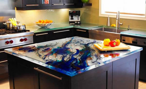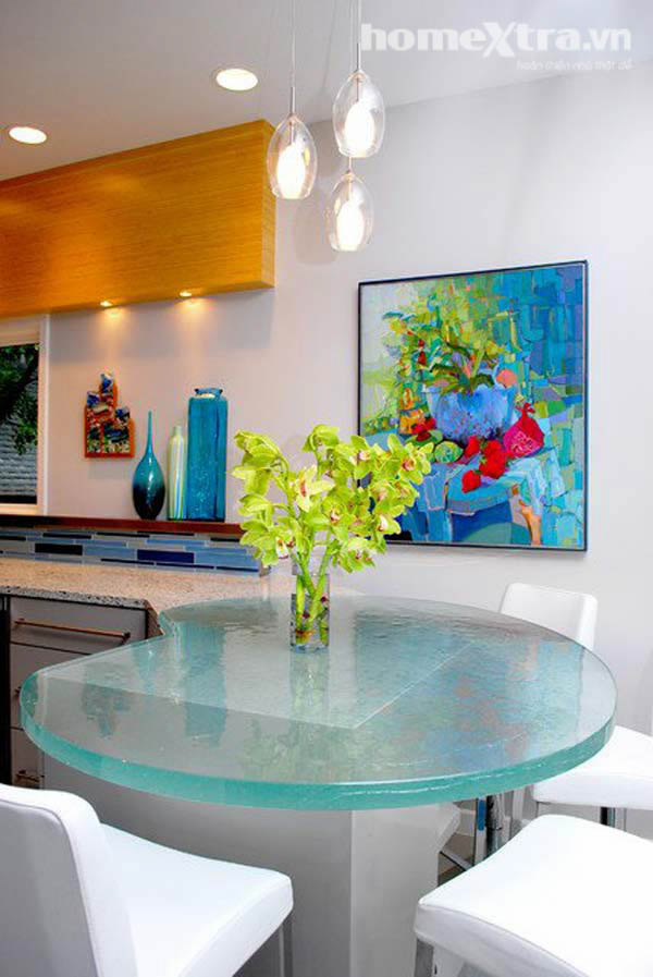 Đặt một lớp thủy tinh trong suốt lên bề mặt bàn bếp là một cách độc đáo, khó "đụng hàng" để tân trang lại căn bếp nhà bạn. Sự tinh khiết và tinh tế của chúng rất dễ hút mắt người nhìn và khiến họ phải trầm trồ ngay từ lần đầu nhìn thấy. Với ý tưởng này, không gian bếp hoàn toàn có thể trở nên hiện đại và độc đáo. Hơn thế nữa, bề mặt thủy tinh trong suốt nhấn mạnh các họa tiết trang trí ở mặt bàn khá hiệu quả và còn mang lại hiệu ứng ánh sáng đẹp mắt.