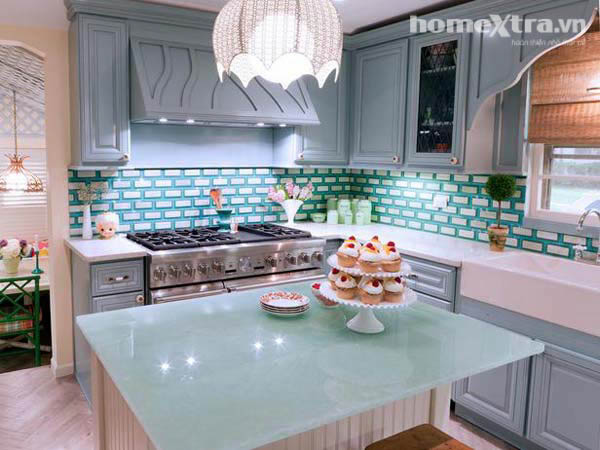 Và lựa chọn kính màu sáng không họa tiết để gây nên cảm giác rộng hơn cho bàn bếp