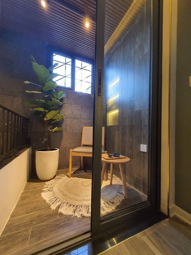 Chị Sương cho biết, về tổng thể, không gian bên trong là sự kết hợp giữa vật liệu gỗ cùng với tông màu sơn giả đá hòa quyện lại tạo lên 1 khối thống nhất. Trong ảnh là 1 góc thư giãn bên trong căn hộ.