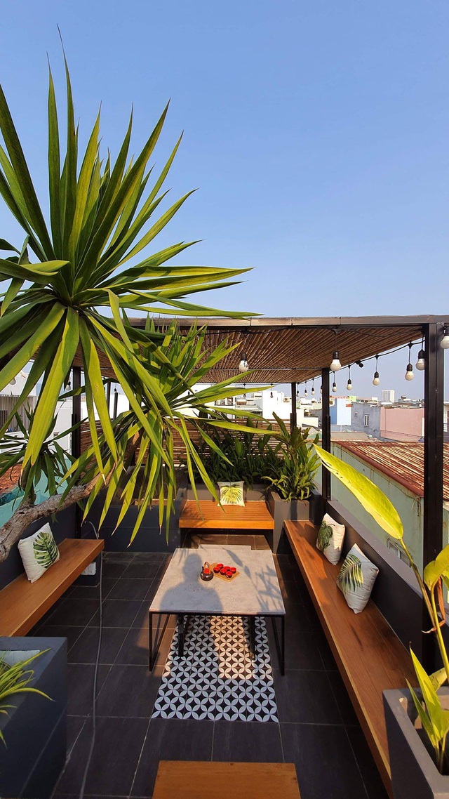 Trên sân thượng, chị Sương đã tạo ra một khu giải trí có thể ngắm biển và làm những bữa tiệc nhỏ cùng gia đình.