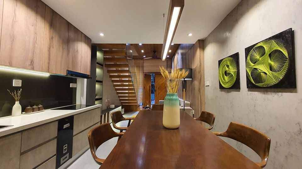 Với mong muốn tạo ra không gian sống xanh, chan hòa với thiên nhiên, toàn bộ không gian ngôi nhà được thiết kế mở, bố trí nhiều cây xanh và tận dụng tối đa ánh sáng tự nhiên ngoài trời. Nội thất căn nhà cũng được thiết kế và sử dụng vật liệu thân thiện với môi trường.