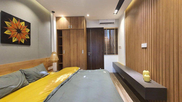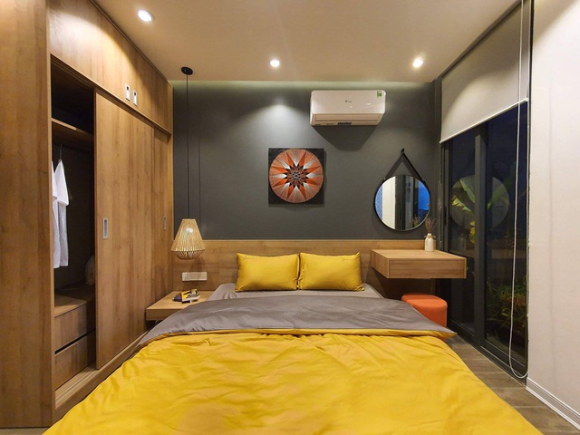 Bên trong phòng ngủ thứ 2 với hệ thống gỗ ốp làm điểm nhấn bên trong, tạo cảm giác gần gũi, thân thiện sau một ngày làm việc mệt mỏi.