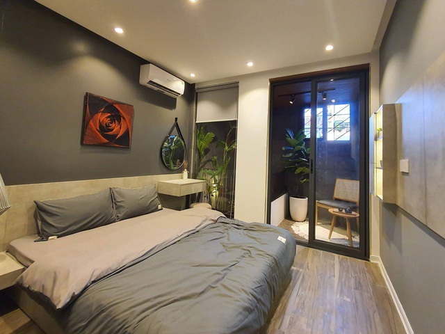 Một trong 3 phòng ngủ trong nhà sử dụng tone màu xám đồng bộ với màu sơn giả bê-tông.