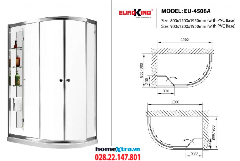 - Euroking EU-4508A kích thước (RxDxC): 800x1200x1950mm và 900x1200x1950mm (đế PVC base)