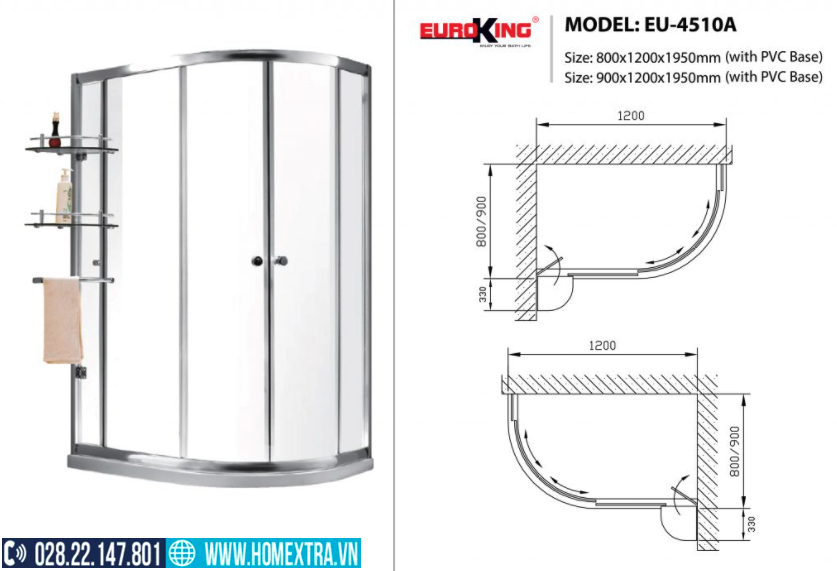 - Kích cỡ: có 2 sự lựa chọn cho người dùng với kích cỡ 800x1200x1950mm, và 900x1200x1950mm. Dạng khối bo quanh góc tường với diện tích bên trong được tối đa cho người sử dụng.