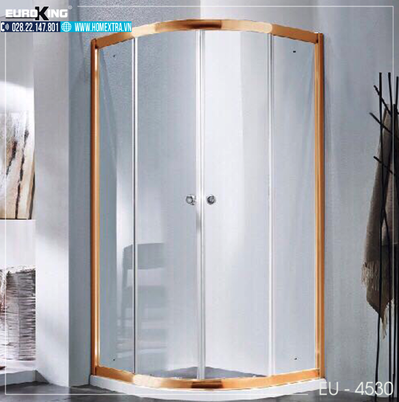 Phòng tắm vách kính EuroKing EU – 4530 khác biệt với thiết kế hình bán nguyệt, bao quanh là lớp kính cường lực trong suốt, mở rộng tầm nhìn trong mọi không gian. Bộ khung sáng bóng ánh vàng kim loại tạo thành điểm nhấn ấn tượng, sang trọng cho phòng tắm.