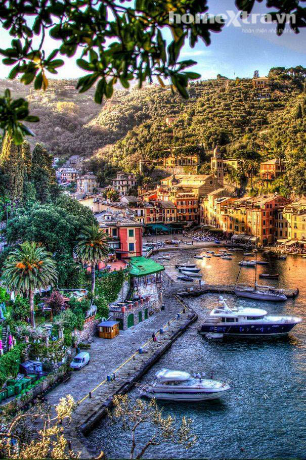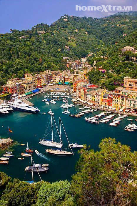 Portofino nằm trong vịnh tự nhiên được bao bọc xung quanh bởi núi cao với cây xanh và những ngôi nhà màu sắc thật hài hòa.