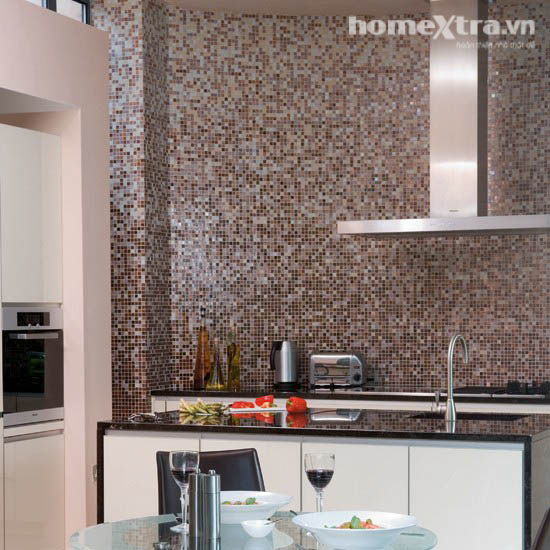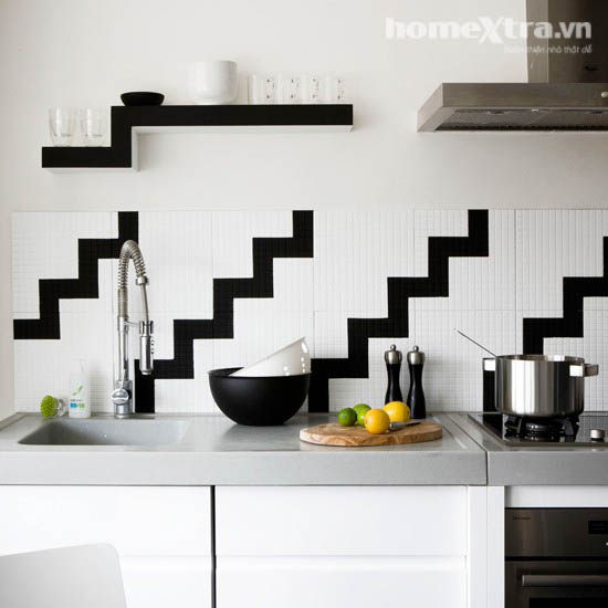 Việc ốp đá một cách ngẫu hững biến điệu khiến căn bếp thêm phần sinh động hơn với sắc đen – trắng.