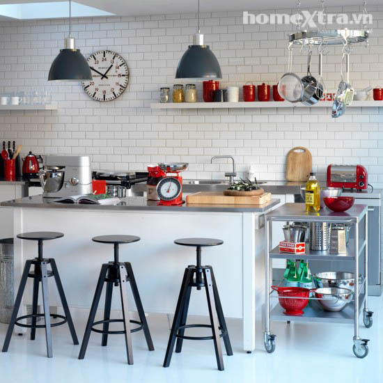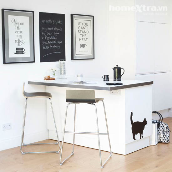 Bên cạnh đó, màu đơn sắc luôn kết hợp hoàn hảo với mọi tông màu như màu xám, xanh lục bảo ngọc hay màu gỗ. Vậy nên việc lựa chọn thêm những đồ nội thất khác sắc đen – trắng là cách giúp bạntrang trí bếp thêm nhẹ nhàng, gần gũi và bắt mắt hơn nhiều.