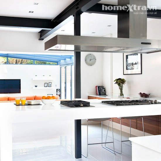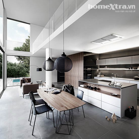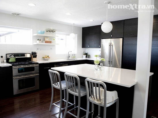 Sử dụng một vài đồ bếp đen đi cùng với sắc trắng khiến căn bếp rất hiện đại với không gian thoáng và sáng. Cùng với đó, việc lựa chọn thêm đồ gỗ cũng giúp không gian bị lạnh và nhàm chán.