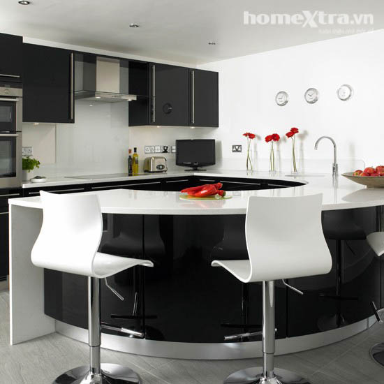 Đen và trắng là một màu sắc thường tạo cảm giác hơi cứng nhắc, do đó việc lựa chọn mẫu nội thất kiểu dáng mềm mại như vài chiếc ghế cong và bàn bán nguyệt tạo cho căn bếp cảm giác uyển chuyển hơn nhiều.