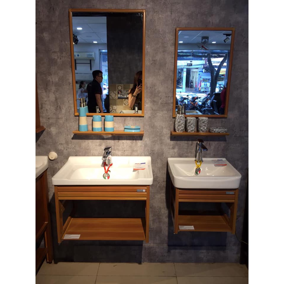 Giá đỡ chậu & kệ gương được làm từ chất liệu nhôm định hình dày dặn chắc chắn không bị hoen gỉ trong môi trường nước, đảm bảo độ bền lâu dài.