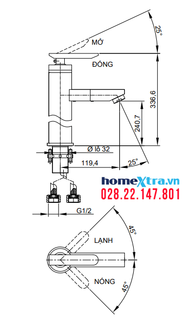 - Vòi lavabo nóng lạnh 1 lỗ, van gốm ceramic Ø35, đầu xoay 360o, bao gồm dây cấp nóng lạnh.